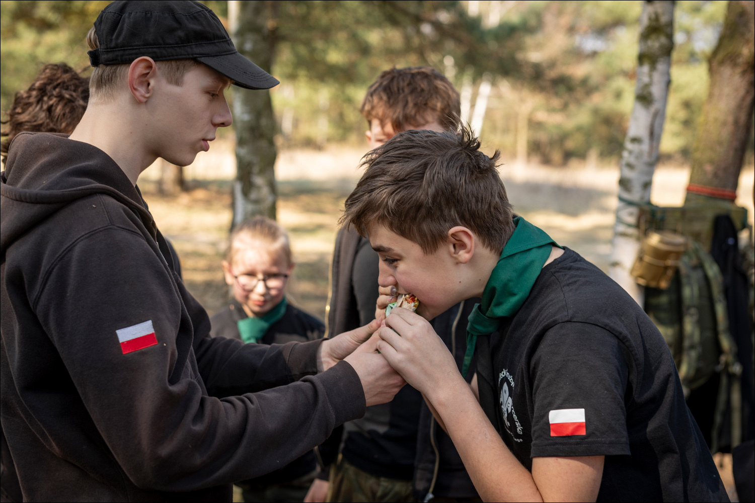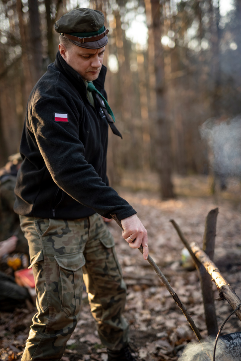 Przyszła pora, aby nowe osoby w drużynie liznęły trochę wiedzy, a Ci co są trochę dłużej przypomnieli sobie dawniej poznane zagadnienia. Dla odmiany dzisiejsza zbiórka zaczęła się na miejscu wigilijnym (czas chwilę odpocząć od „skarpy” i jej okolic). Tematem było sprawdzenie naszych umiejętności poruszania się po terenie z mapą i wyznaczaniu azymutów. Dla wielu nowych osób był to pierwszy kontakt z mapą, busolą i wyznaczaniem kierunków w terenie. Po krótkim przypomnieniu zasad musztry ruszyliśmy na miejsce wielkanocne, skąd miał się zacząć bieg. Kiedy już tam doszliśmy, zostaliśmy podzieleni według naszych umiejętności na grupy (patrole) jedno, dwu i trzyosobowe.
