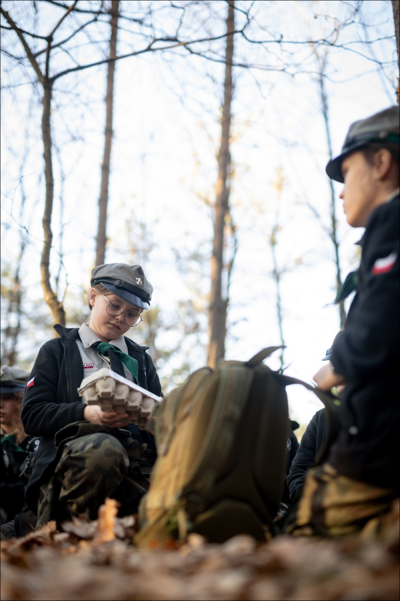 Zadanie polegało na zbudowaniu noszy i przeniesieniu rannego w bezpieczne miejsce. Następnie ruszyliśmy na punkt trzeci kierując się we wskazanym na przełaj kierunku w stronę obwodnicy. Na kolejnym punkcie zadaniem naszym było aby każda osoba z patrolu przeszła w masce przeciwgazowej przez komorę gazową, którą obecnie jest tunel w obwodnicy. Kolejny punkt wymagał od nas umiejętności podchodzenia. Polegał na tym abyśmy całym patrolem niezauważeni przez niebezpiecznego kryjącego się w oddali wartownika założyli na maszt flagę i nadal niezauważeni powrócili w bezpieczne miejsce. Na koniec w pobliżu ostatniego punktu siedliśmy przy ognisku, aby pogadać i opiec przyni